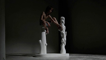 Sur une des vidéos, celle qui correspond au socle de Dionysos, tu poses avec ton fils ; vous apparaissez et disparaissez successivement. Ça a un sens particulier pour toi, un sens qui serait lié au mythe?